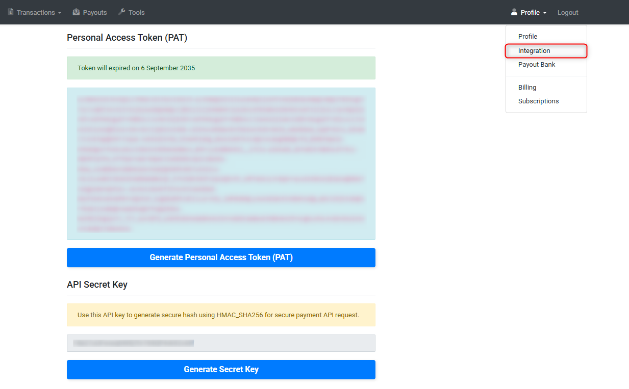 1. Untuk mendapatkan “Personal Access Token (PAT)” dan “API Secret Key”. Di bahagian menu, atas sebelah kanan klik pada “Profile” dan pilih “Integration”.