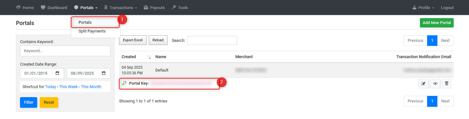 2. Bagi mendapatkan “Portal Key” , di bahagian menu atas sebelah kiri klik pada “Portal”. Pilih portal yang berkaitan dan salin (copy) Portal Key yang berkenaan.